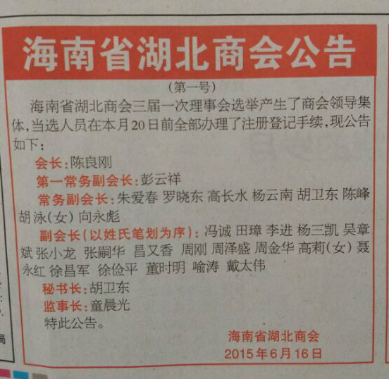 日前,在海南省湖北商會(huì)舉辦的三屆一次理事會(huì)選舉中,大會(huì)選舉表決通過(guò)了會(huì)長(zhǎng)、第一常務(wù)副會(huì)長(zhǎng)、常務(wù)副會(huì)長(zhǎng)、秘書(shū)長(zhǎng)及監(jiān)事長(zhǎng)人選,其中我公司總經(jīng)理高莉女士當(dāng)選副會(huì)長(zhǎng)職務(wù)。