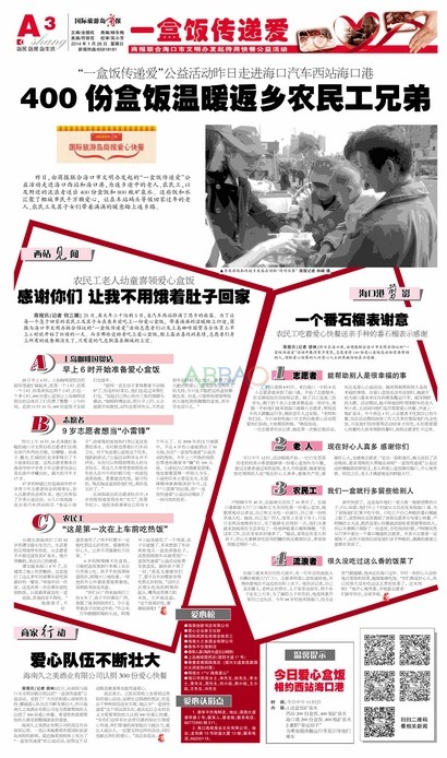 高總表示,之前在報紙上也看到過類似的愛心活動,還萌生過捐酒的想發(fā).但是由于種種原因沒有實現(xiàn),她認為"一盒飯傳遞愛"這個倡議很實在,就決定以企業(yè)的名義為需要幫助的人認捐300份愛心快餐."有你們這樣有社會責任感的報社引領愛心傳遞,我們普通的商家能出力就出力,能出人就出人,一定要支持這樣的活動,同時也獻出我們的愛心."高總如是說.