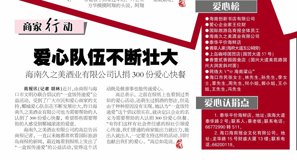 海南久之美酒業(yè)有限公司的高總告訴商報記者,一直以來她都喜歡看國際旅游島商報的新聞,最近她看到報紙上發(fā)出了"一盒飯傳遞愛"的公益活動,覺得這個活動既是做善事也能傳遞愛心.